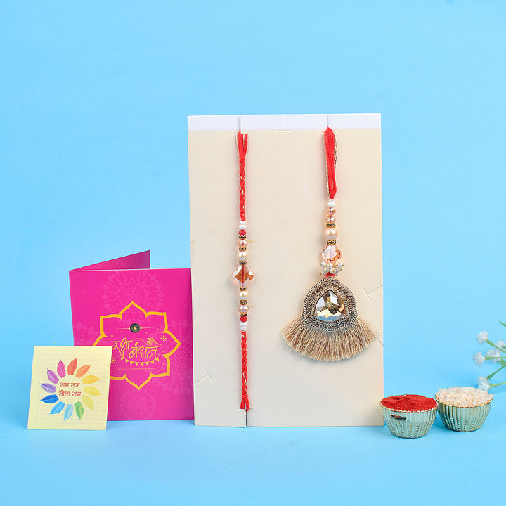 • Package: 1 Men Rakhi, 1 Women Lumba Rakhi, Roli Chawal Pack, Ram & Sita Theme Stickers