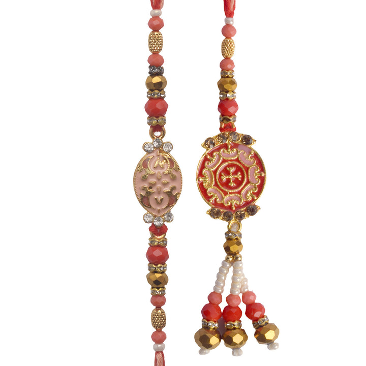 • About Product: Celebrate the eternal bond of love and tradition with this beautifully crafted Couple Rakhi Set designed for Bhaiya and Bhabhi. The men’s rakhi is bold and elegant, while the women’s lumba is graceful and festive—perfectly complementing each other as a symbol of togetherness.