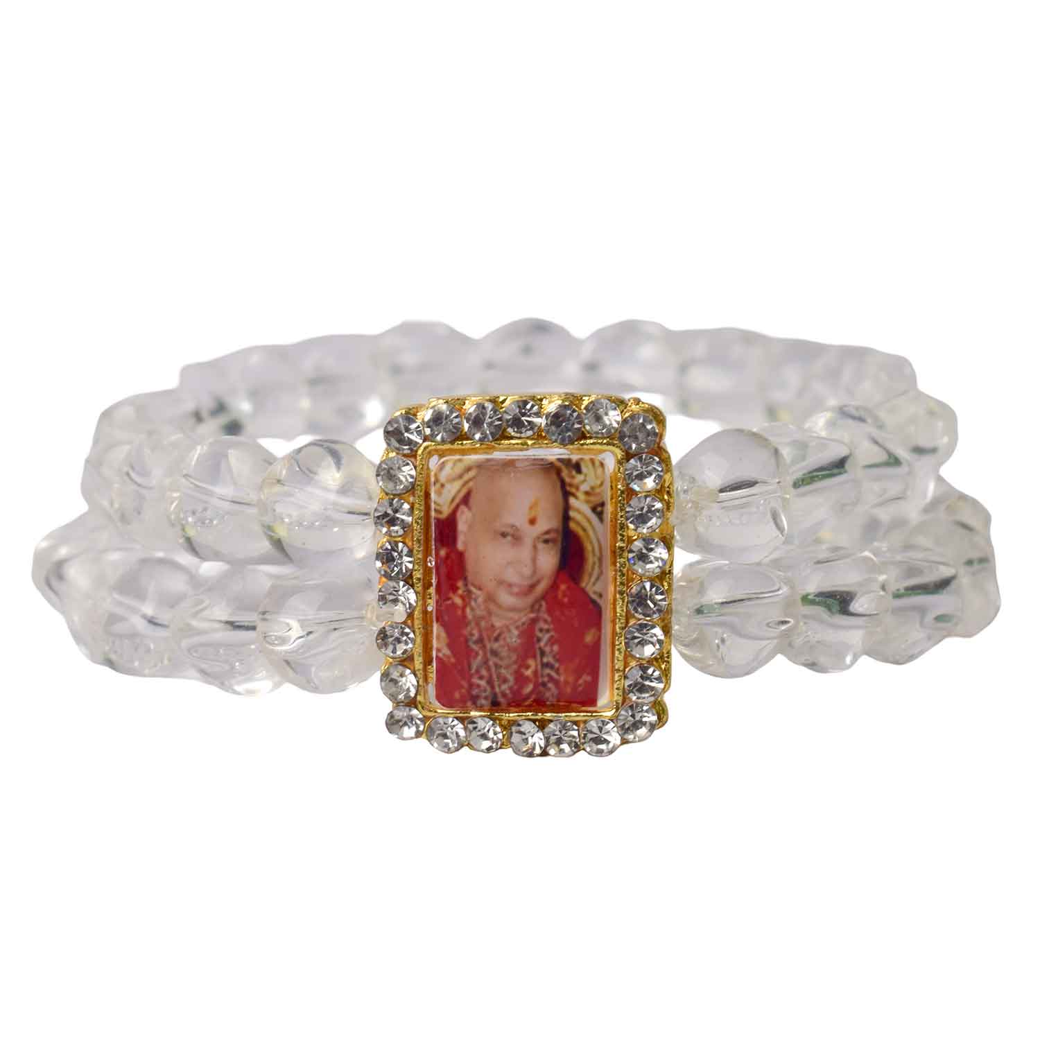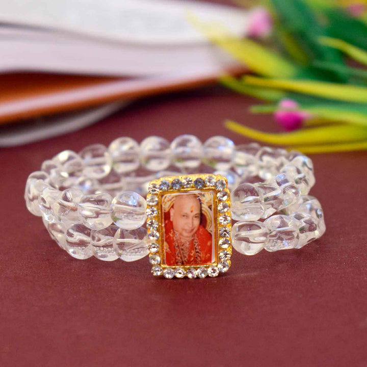 Our Guruji bracelet is a tangible symbol of divine connection. Crafted with care and reverence, it is designed to be worn close to your heart, serving as a constant reminder of Guruji's presence. The bracelet is adorned with sacred symbols and gemstones that hold spiritual significance, channeling positive energy and protection.