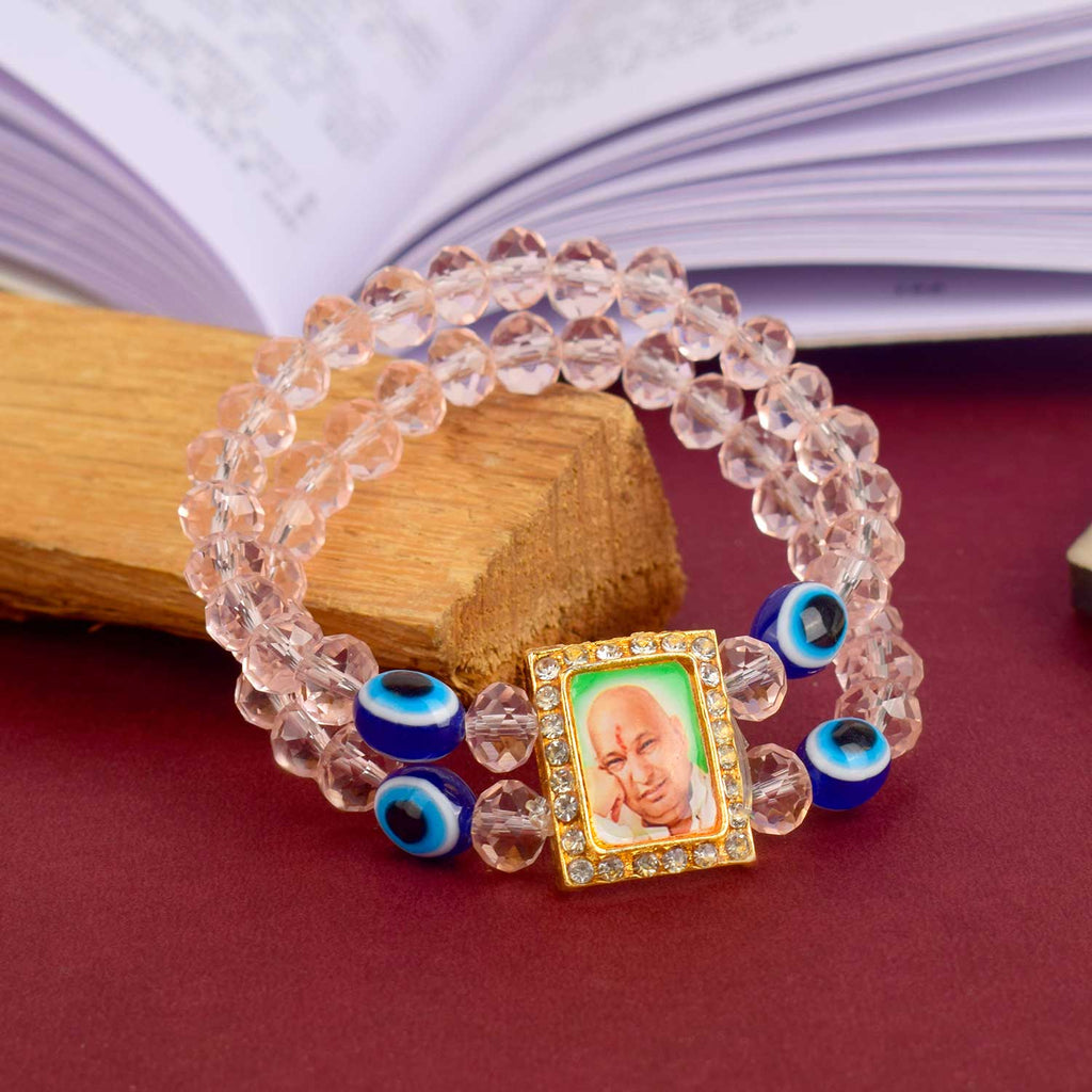 jai guruji bracelet, guruji swaroop bracelet, pink beads bracelet, evil eye bracelet india, guruji charm bracelet, spiritual bracelet for men, spiritual bracelet for women, handmade guruji bracelet, daily wear spiritual bracelet, satvikstore bracelet, pooja return gift, meditation accessory, guruji jewelry, protective bracelet, spiritual fashion accessory