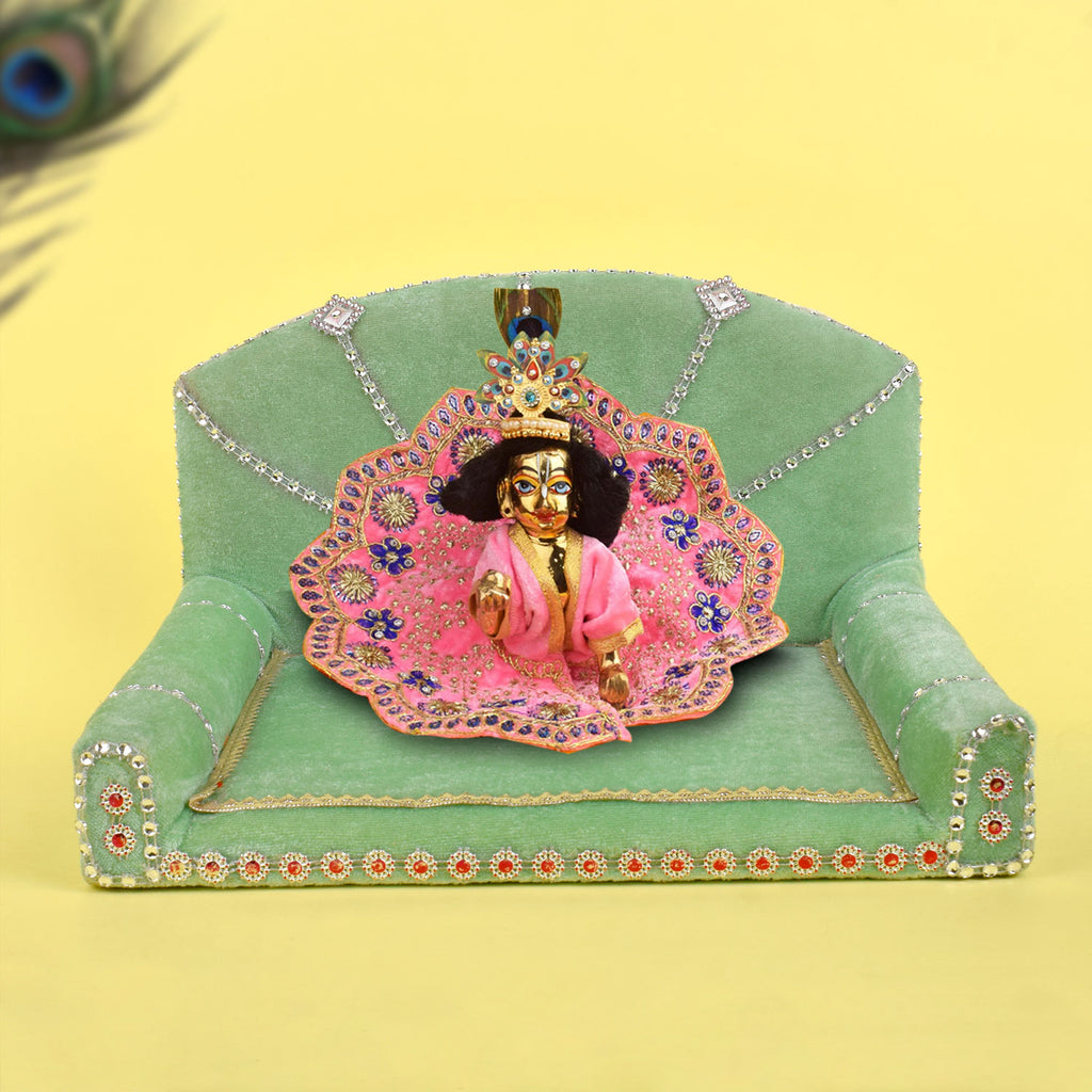 As you place your Laddu Gopal on this sacred throne, watch as the velvet embraces the little lord, showering blessings and grace upon your home. Its charming allure and captivating design make it a true centerpiece of devotion, adding a touch of splendor to your worship space.