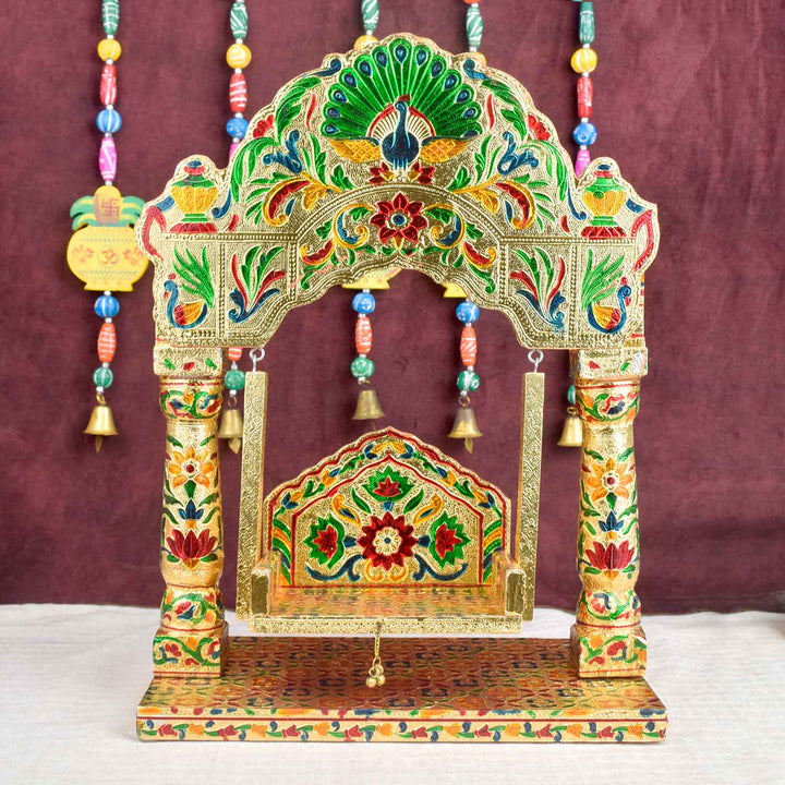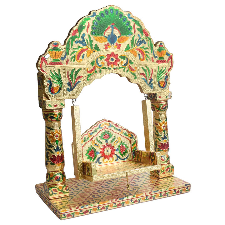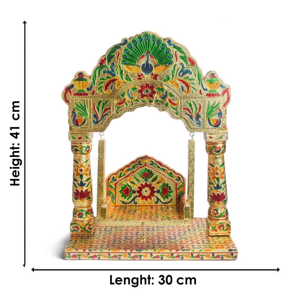 meenakari laddu gopal jhula | royal darbar kanha ji swing | singhasan style krishna swing | meenakari pooja essentials | temple swing for laddu gopal | traditional krishna jhula | satvikstore kanha jhula | decorative krishna swing | gold metal pooja swing