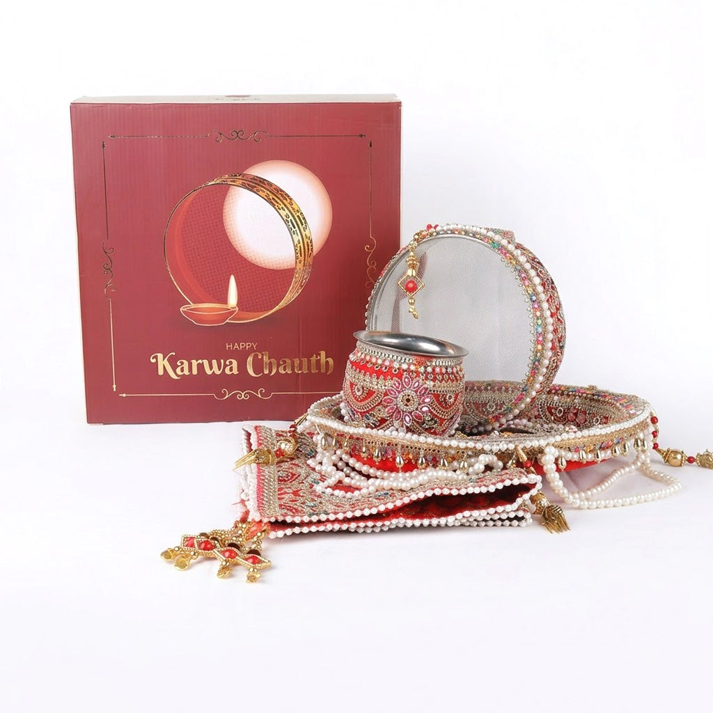 About Product: Celebrate the divine bond of love and tradition with our 11 Pc Red Embroidery Karwa Chauth Thali Set, specially curated for women observing this auspicious vrat. Featuring a vibrant red velvet finish thali adorned with intricate golden embroidery and beadwork, this complete pooja kit embodies elegance and devotion. Whether you are a newlywed celebrating your first Karwa Chauth or a seasoned devotee, this set equips you with every essential needed to perform the rituals with grace and reverence. It combines aesthetic appeal with cultural significance, making it the perfect centerpiece for your moon sighting ceremony.