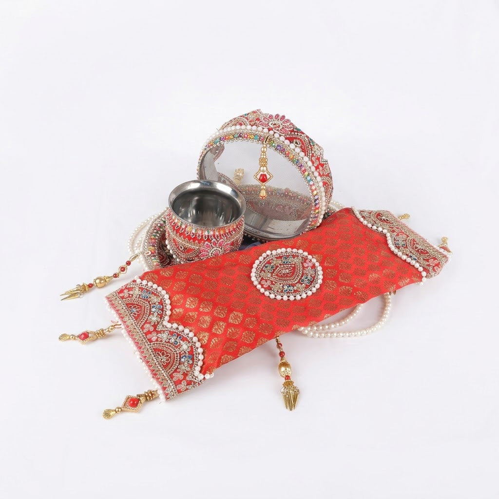 Item Name: 11 Pc Elegant Red Embroidery Karwa Chauth Thali Set with Cover – Complete Puja Kit