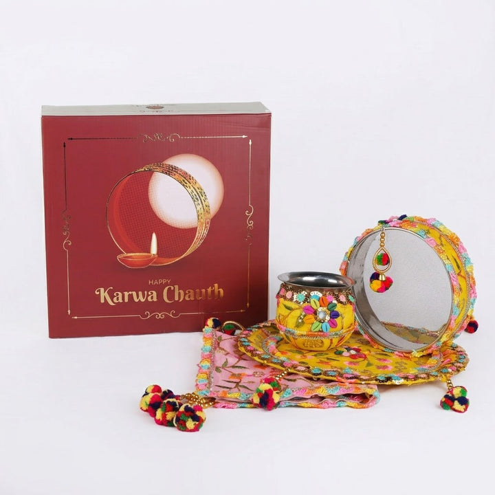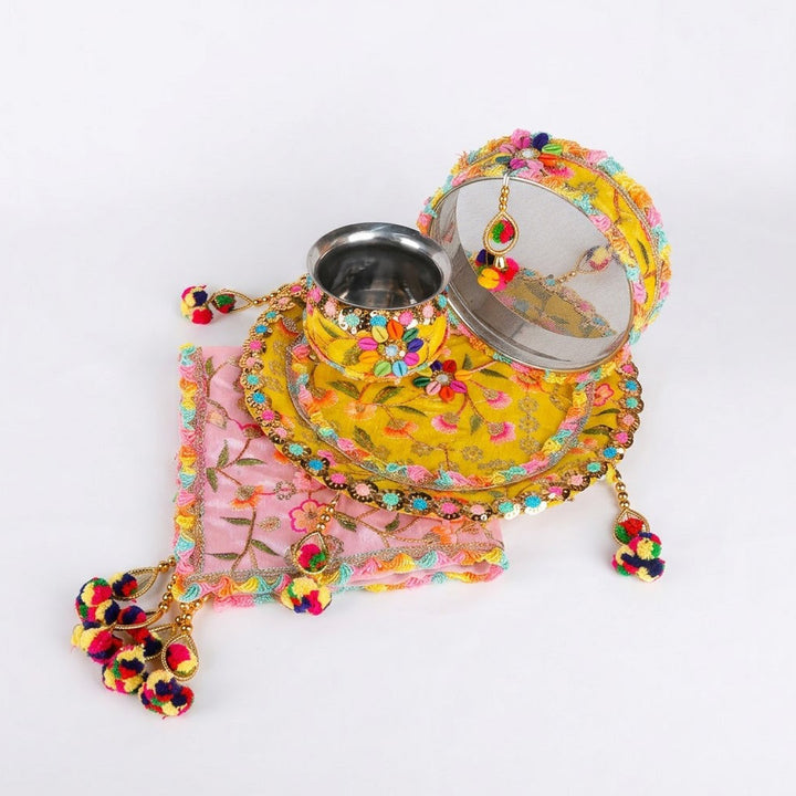 Buy 11 Pc Elegant Yellow & Pink Embroidery Karwa Chauth Thali Set | Satvikstore.in – satvikstore.in