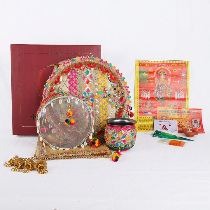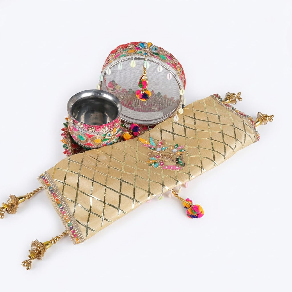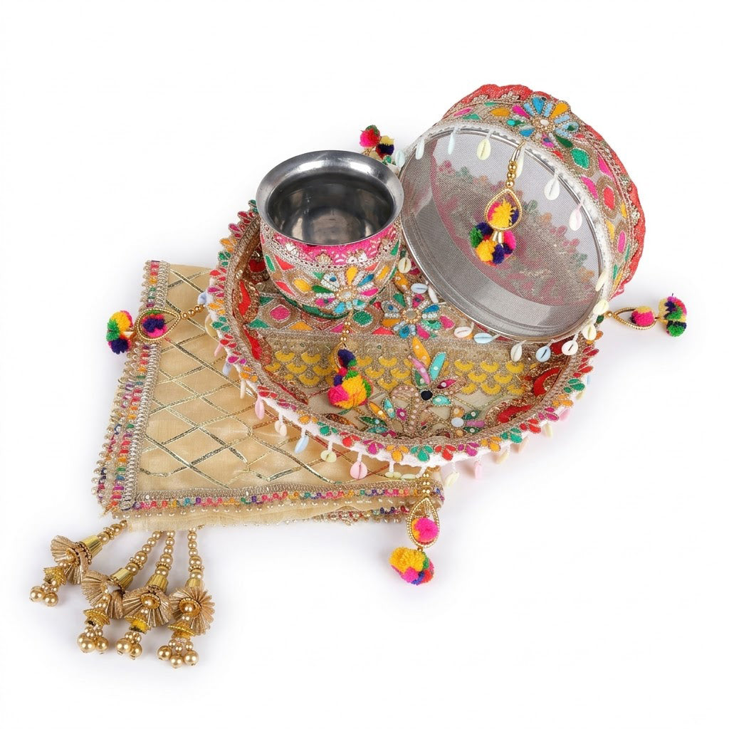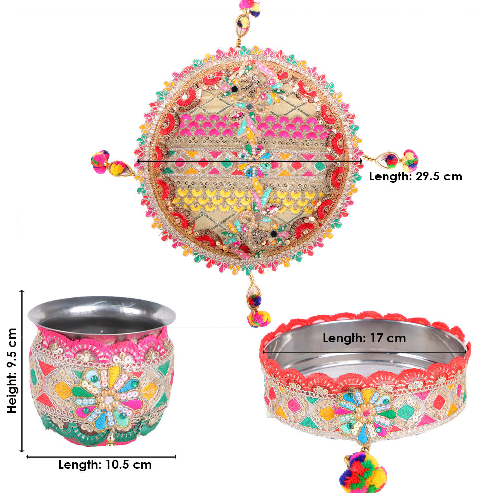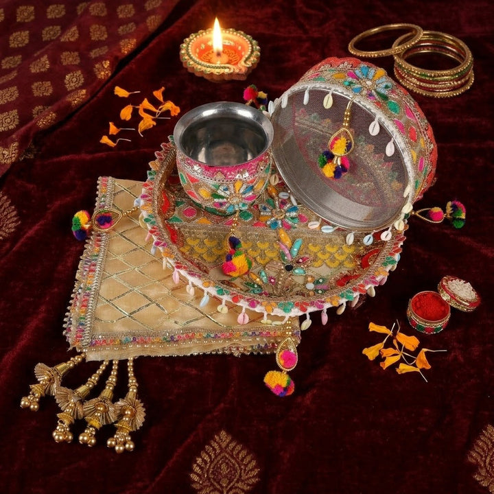 Golden Colourful Karwa Chauth Thali | Karwachauth Puja Kit | Embroidered Thali with Sieve and Kalash | Colourfully Pooja Thali Set | Designer Karwa Chauth Thali | Karva Chauth Thali Cover Set | Karwa Chauth Complete Kit | Royal Thali Gift Set