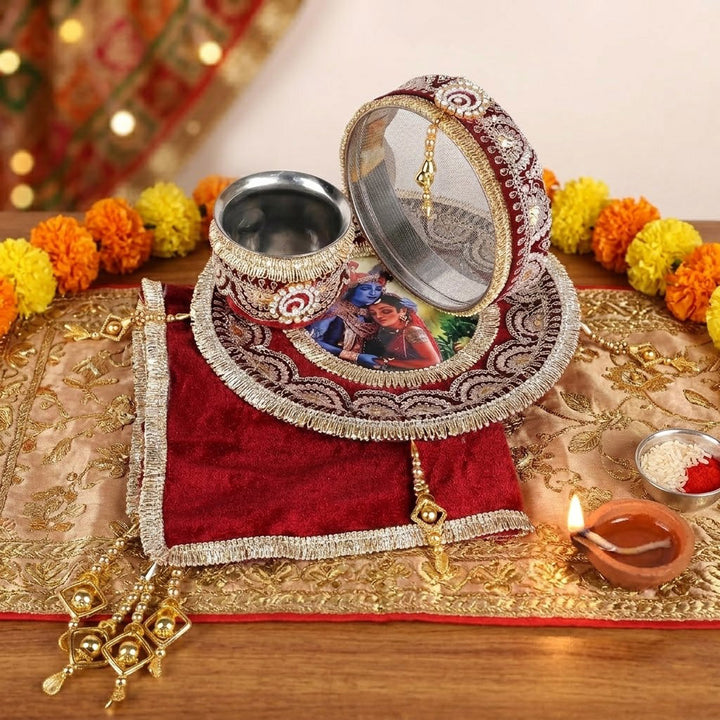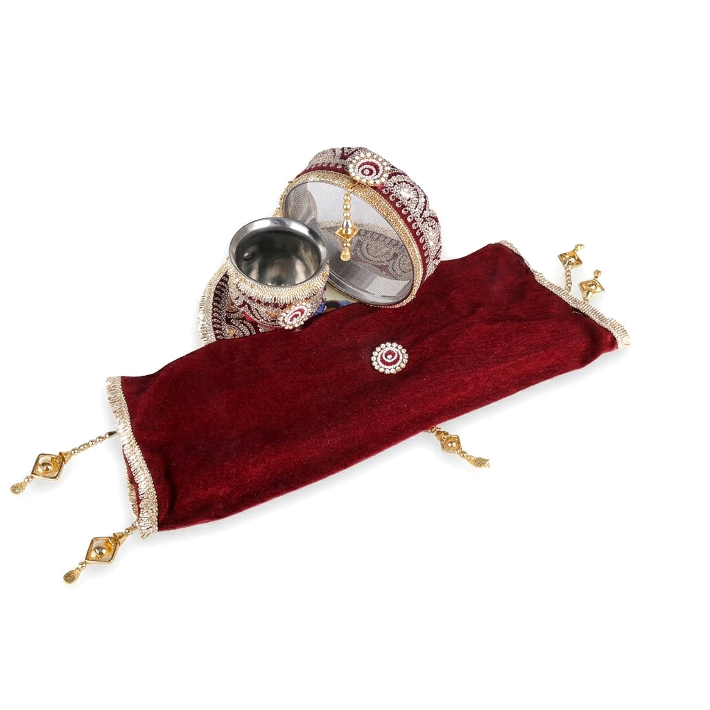 Item Name: 11 Pc Maroon Embroidery Karwa Chauth Thali Set with Cover – Complete Puja Kit