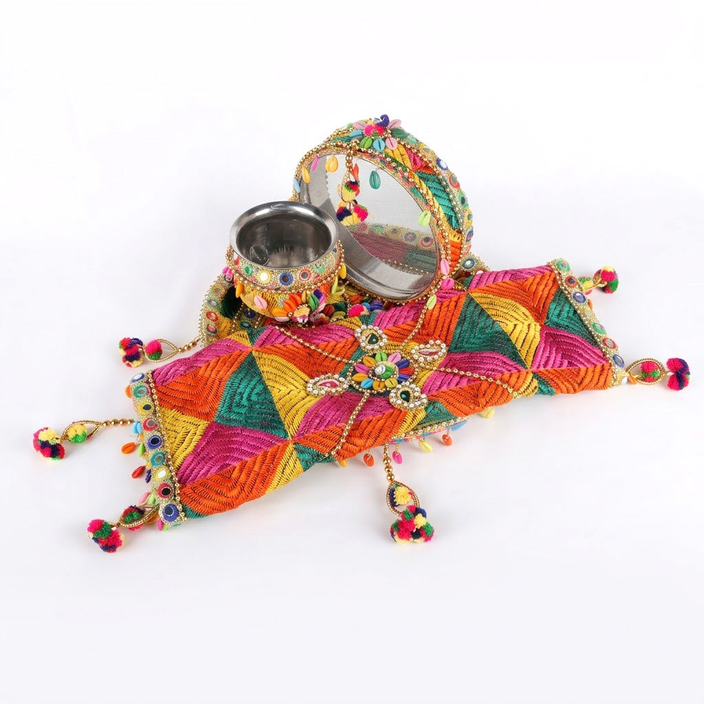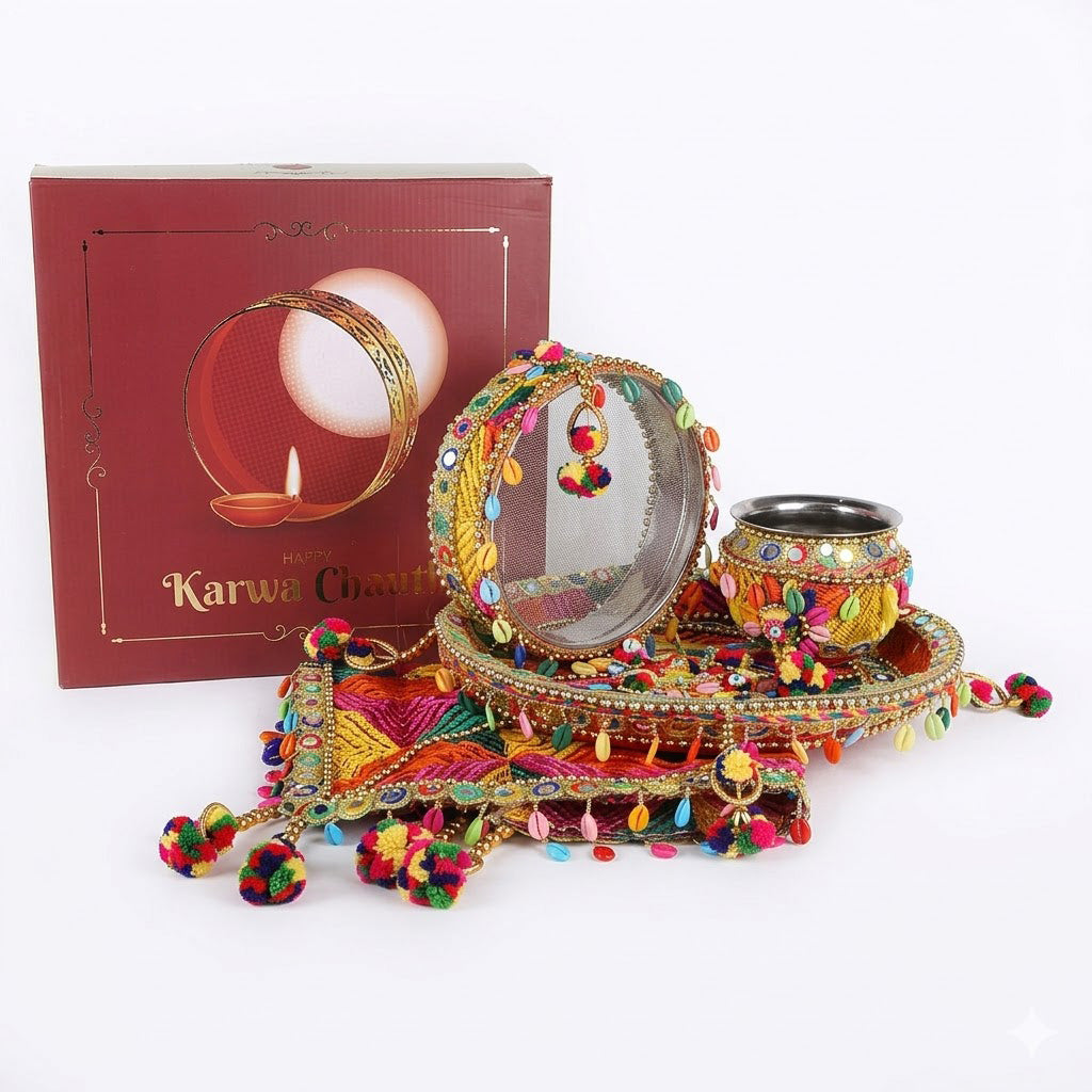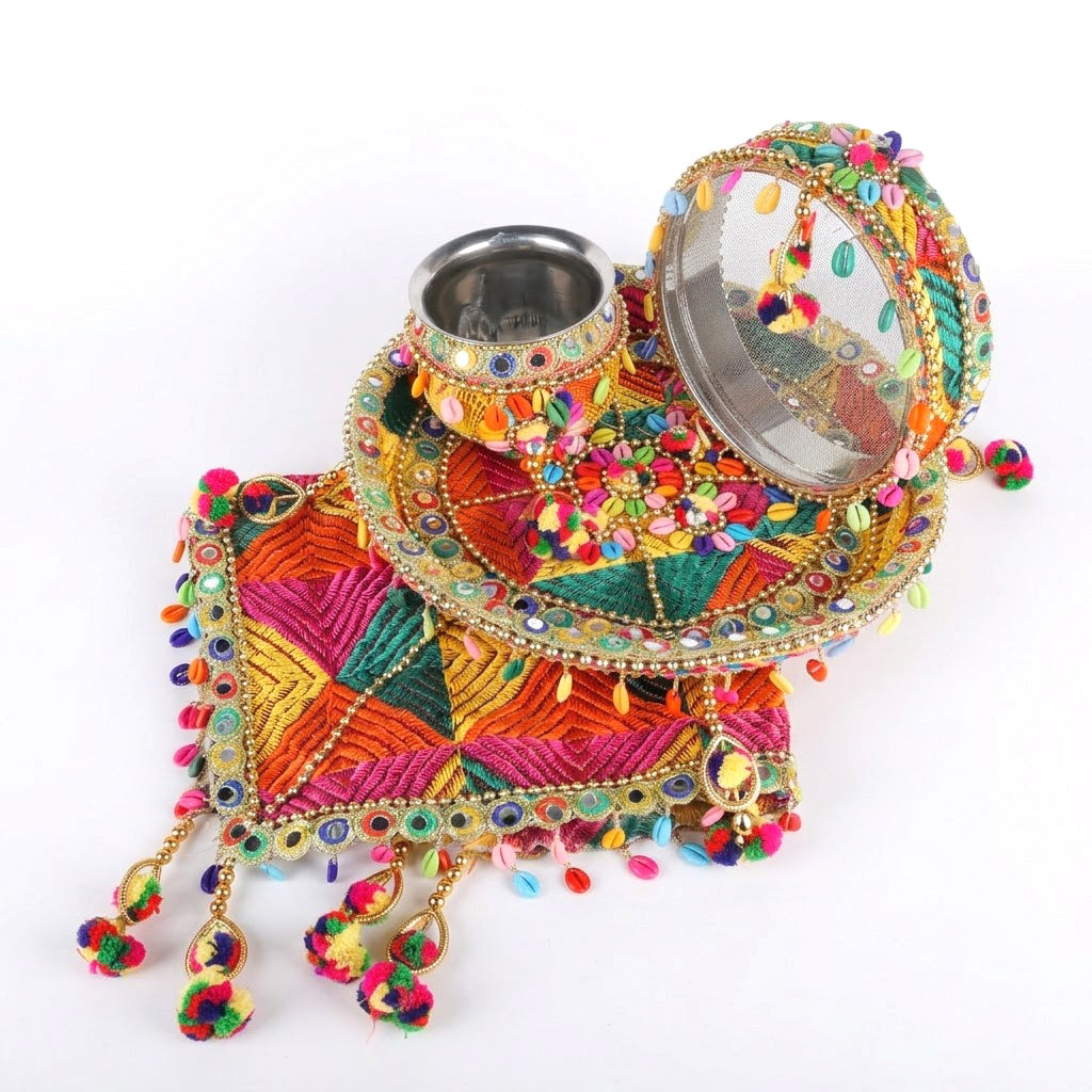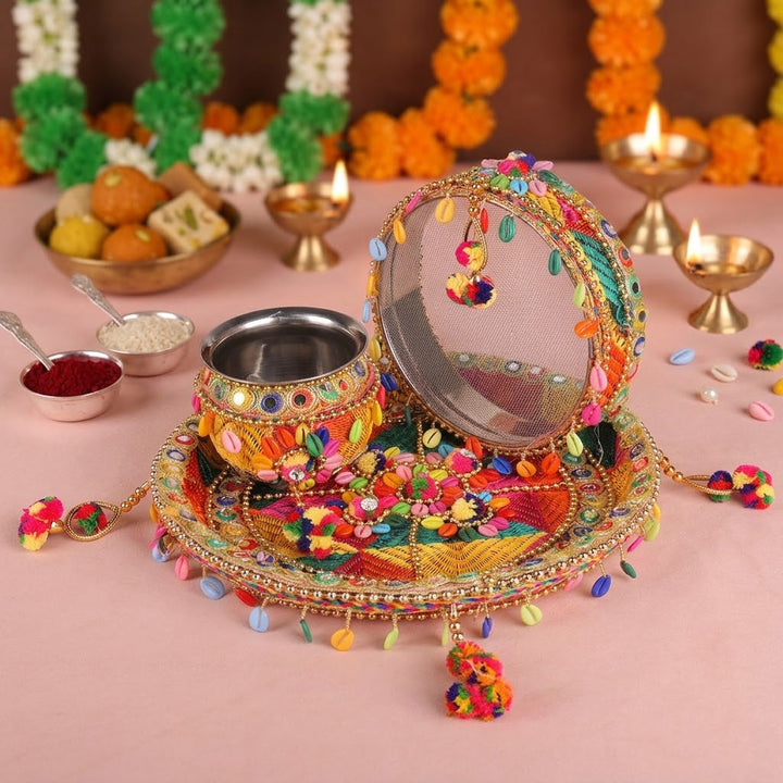 Colourful Karwa Chauth Thali | Karwachauth Puja Kit | Embroidered Thali with Sieve and Kalash | Multicolor Pooja Thali Set | Designer Karwa Chauth Thali | Karva Chauth Thali Cover Set | Karwa Chauth Complete Kit | Puja Thali Gift Set