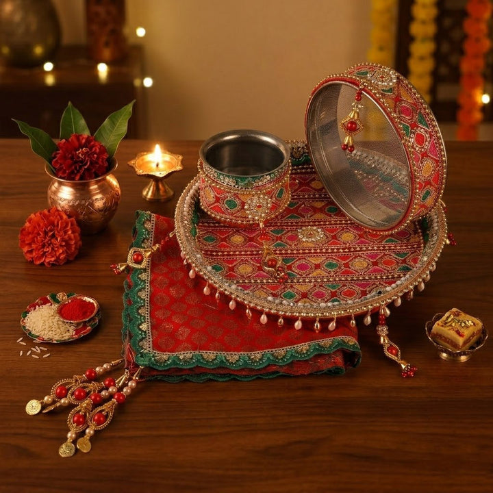 Item Name: 11 Pc Stunning Red Embroidery Karwa Chauth Thali Set with Cover – Complete Puja Kit