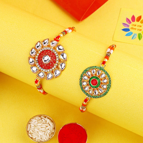Meenakari Rakhi Set of 2: Adorned with intricate Meenakari work, these rakhis exude the essence of cultural heritage and artistic finesse. The vibrant colors and delicate patterns make these rakhis a true celebration of sibling love.