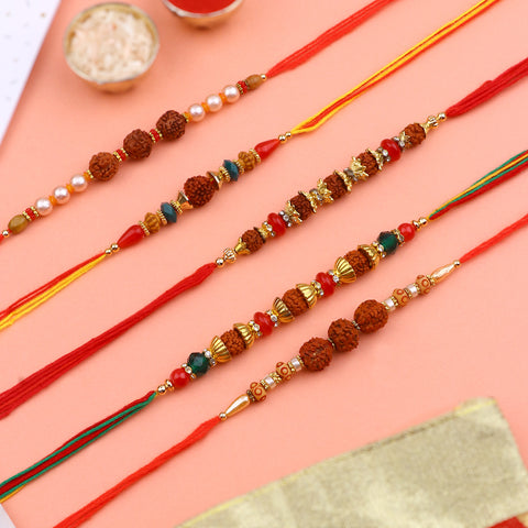 Beaded Bhaiya Rakhi Set of 5: Adorned with colorful beads, these rakhis represent the joyous journey of growing up side by side. Embrace the nostalgia and affection with this delightful beaded rakhi set.