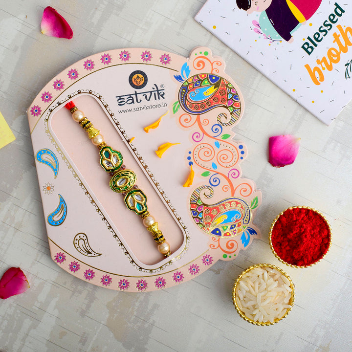 • About Product: Celebrate Raksha Bandhan with our handcrafted Rakhis! Our collection includes beaded Rakhis, elegant Kundan Rakhis, and opulent Zardosi Rakhis, all meticulously designed with love and care. These exquisite creations are a perfect way to express your affection and strengthen the bond with your siblings. Each Rakhi reflects the artistry of our skilled artisans, making them unique and special. Choose from a variety of vibrant colors, intricate patterns, and sparkling stones to find the perfect Rakhi that complements your sibling's style. Embrace the tradition of Raksha Bandhan with our handcrafted Rakhis and create cherished memories that last a lifetime. Shop now and make this Raksha Bandhan an extraordinary celebration of love and togetherness!