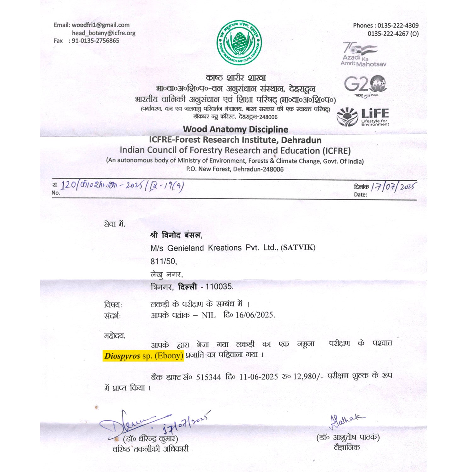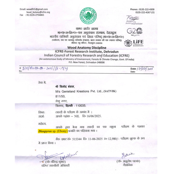 • Tested by: Authenticity certified by Central Wood Testing Laboratory, The Rubber Board (Ministry of Commerce & Industry, Govt. of India), and ICRE – Forest Research Institute, Dehradun – ensuring genuine Karungali wood quality.