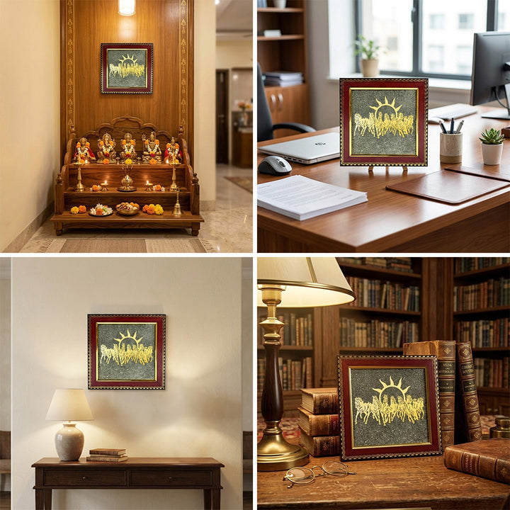 This unique frame blends natural raw pyrite crystals with the auspicious seven horses design, making it ideal for homes, offices, shops, and workspaces. It not only enhances the visual appeal of your space but also supports positive energy flow, confidence, and steady progress in career and business.