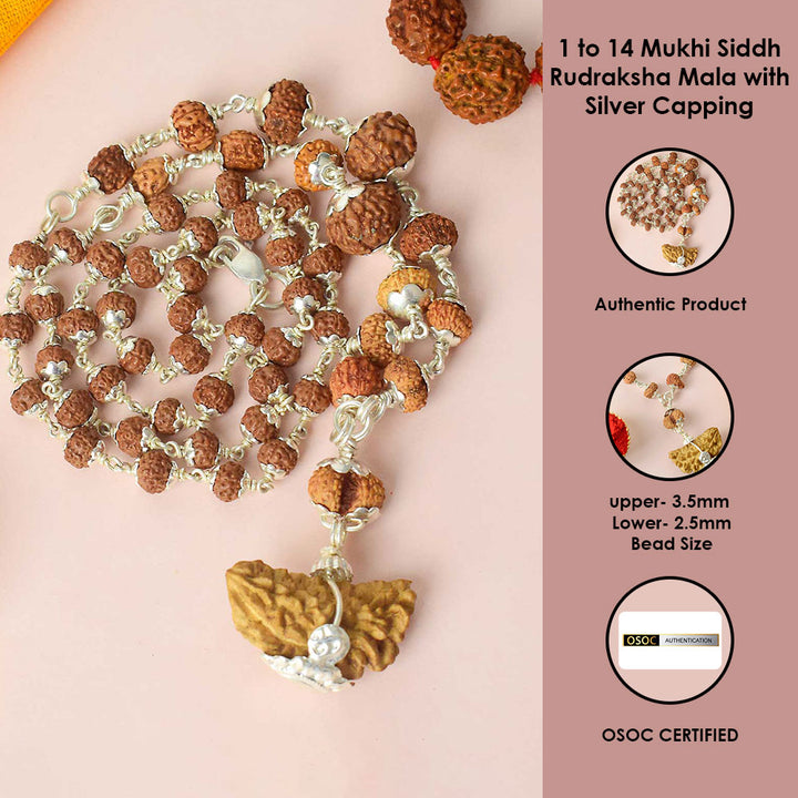 • Material :  Certified 1 to 14 Mukhi Siddh Rudraksha Mala with Silver Capping (Indo)