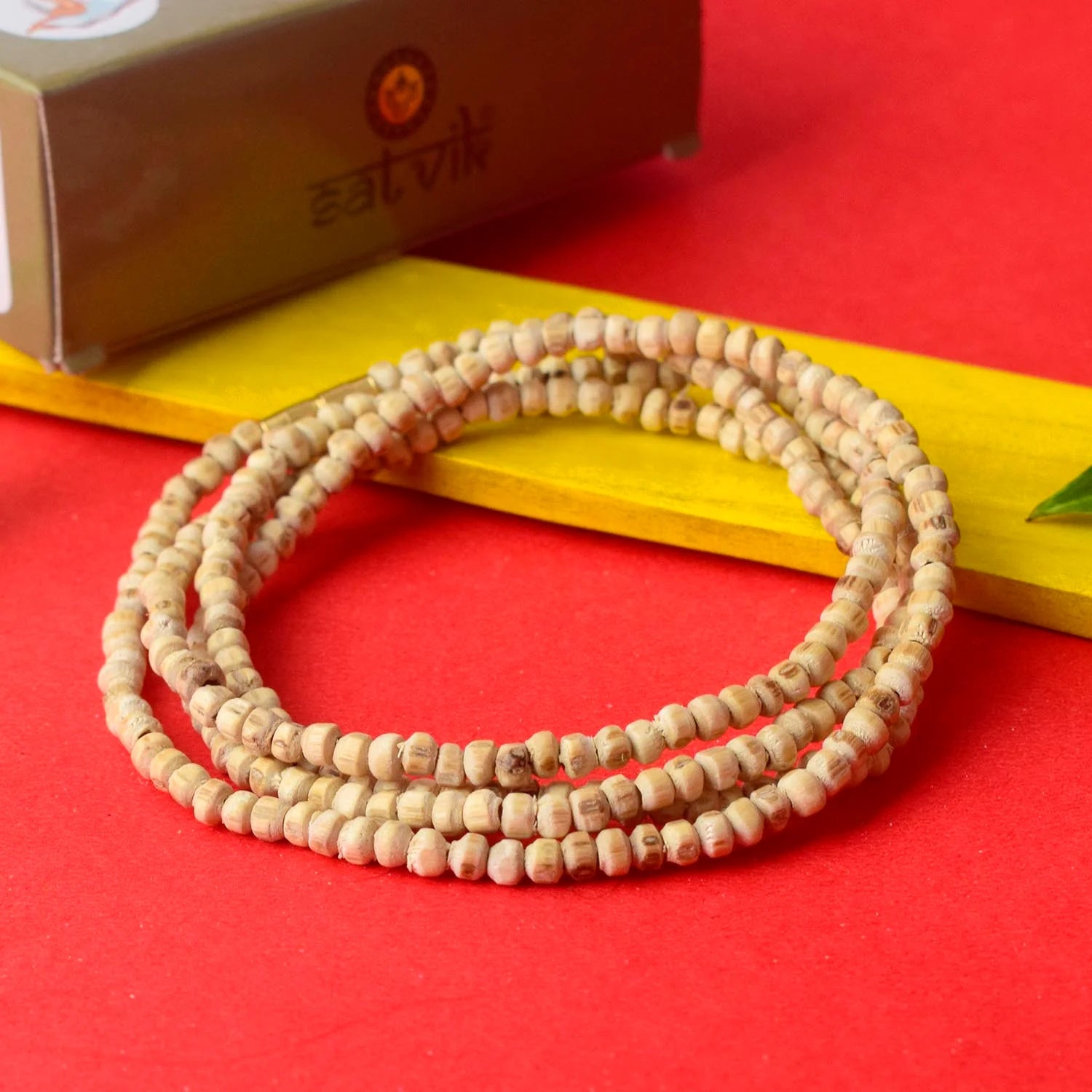 A genuine Tulsi Mala is crafted from the thin branches of the Tulsi plant, after carefully removing its outer skin (bark). This process ensures that the beads retain the sacred properties of Tulsi, making them spiritually powerful.
