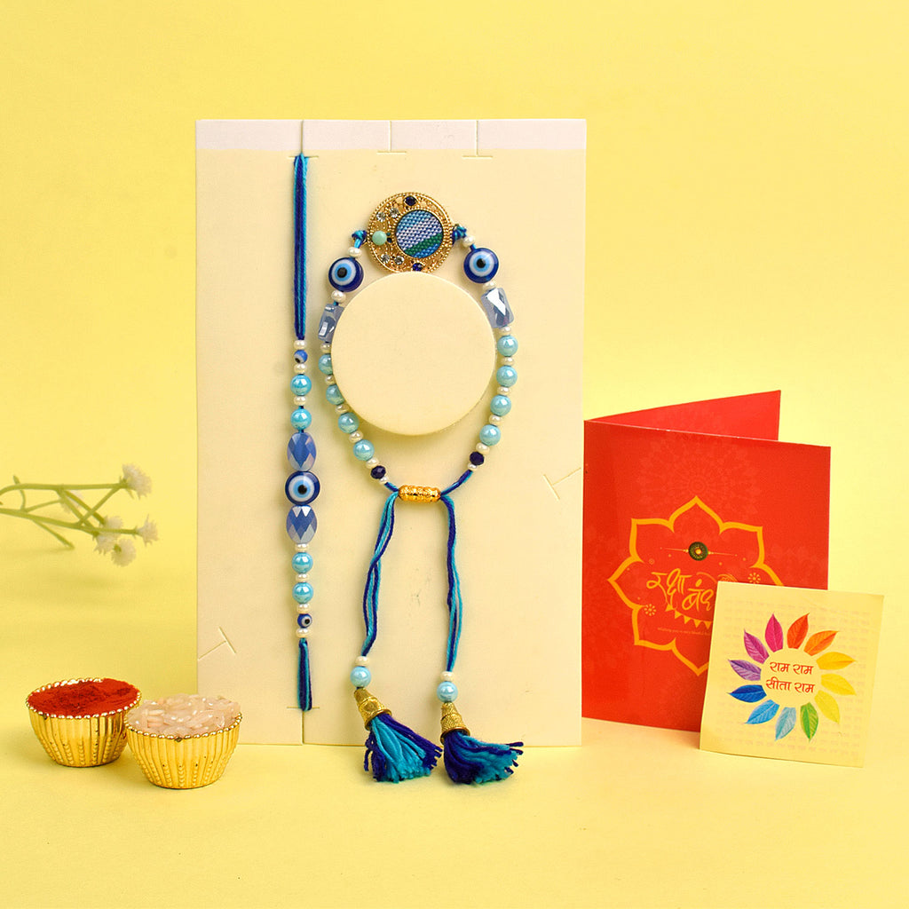 • Package: 1 Men Rakhi, 1 Women Lumba Rakhi, Roli Chawal Pack, Ram & Sita Theme Stickers