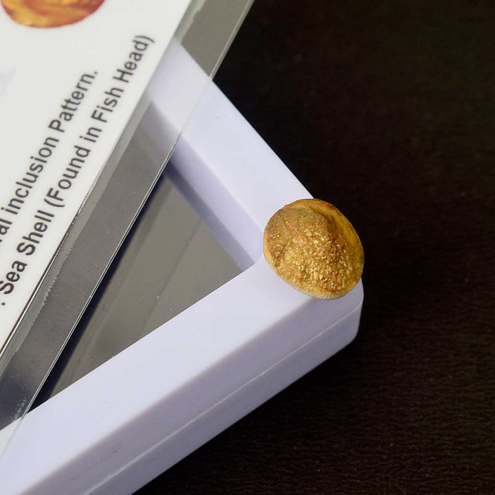 About Product: The Natural Machh Mani, also known as Fish Pearl or Machmani, is a rare and spiritually significant gem revered in Vedic traditions. It is said to originate from inside special species of aquatic creatures and is cherished for its divine properties and astrological benefits. This sacred artifact, coated in a golden finish, is used to channel powerful energy during spiritual practices, rituals, and protective ceremonies.