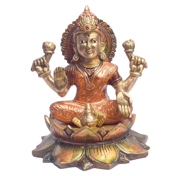 • Lakshmi, the Goddess of wealth, prosperity, and fortune, is typically depicted with her graceful and serene posture, holding lotus flowers and gold coins, symbolizing abundance and blessings.