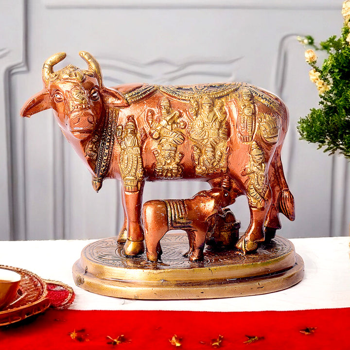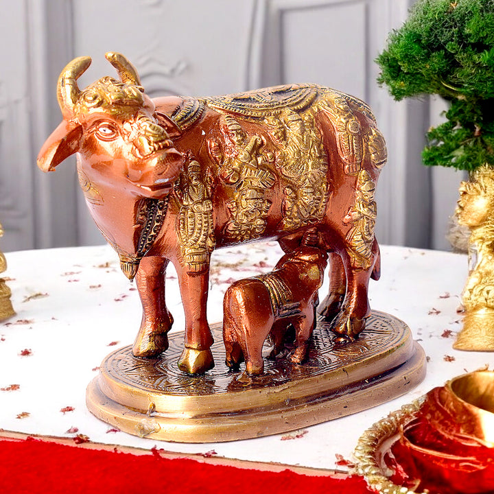 About Product: This Divine Brass Kamdhenu Cow with Calf Idol symbolizes prosperity, abundance, and motherly love. Crafted from high-quality brass, this intricately designed idol depicts the sacred Kamdhenu cow and her calf, bringing a sense of spiritual blessings and peace to your home. Perfect for worship, home décor, or gifting, it is a timeless symbol of divine grace and prosperity, making it a meaningful addition to any sacred or living space.