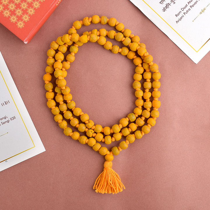 • Material : Made from High Quality Natural Haldi Beads to maintain the purity of Jaap Mala The beads is woven in Red Cotton Thread, A colored Fringe is also joint in the Mala.