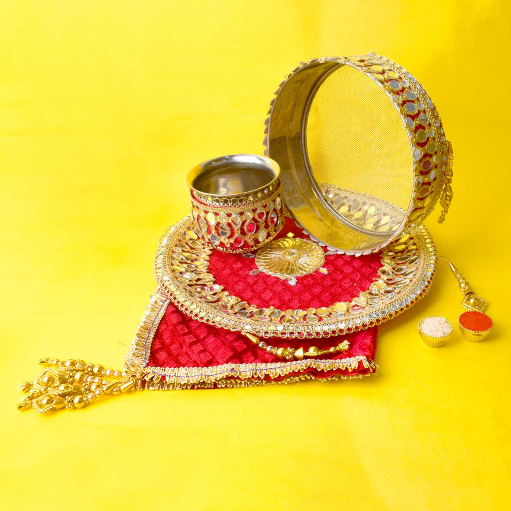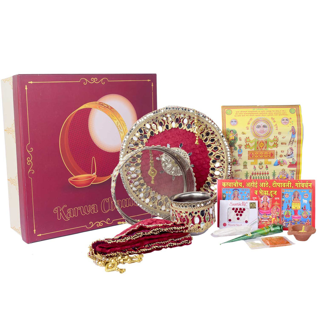 Shop Maroon Mirror Work Karwa Chauth Thali Set 11 Pc | Satvikstore.in – satvikstore.in