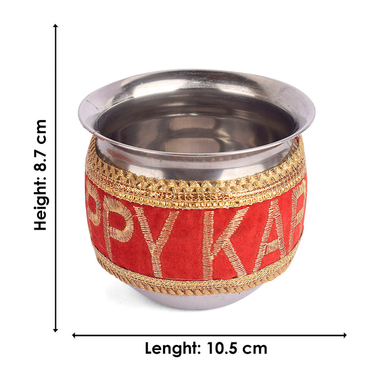 Design: Beautiful Handcrafted Designer Karwa Thali with Fabric all over the Thali and Lace Work all over the Lota and Sieve (Channi), Which makes it more Attractive.