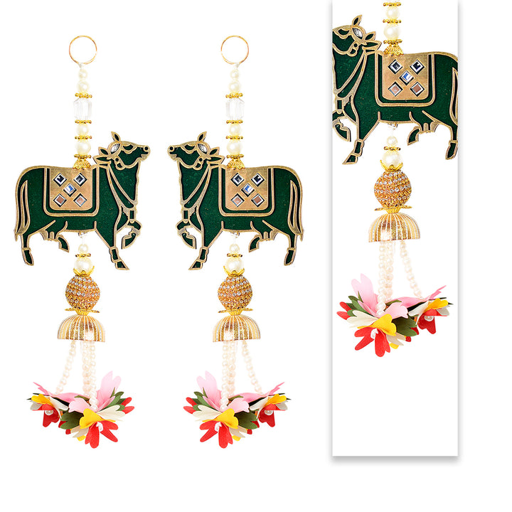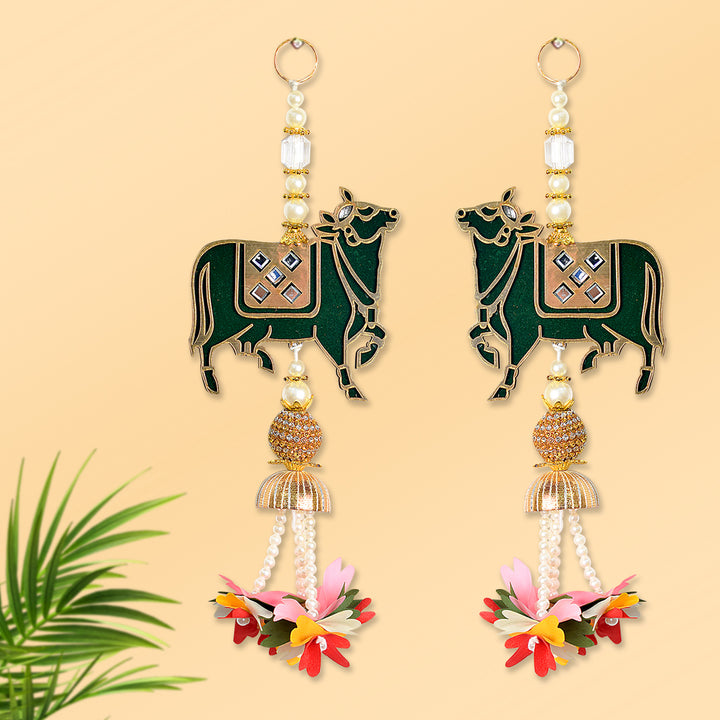 cow side door hanging | acrylic cow wall décor | floral cow wall hanging | mirror and bead toran | tassel side hanging | traditional pooja décor | spiritual home decoration | gopashtami décor | navratri pooja decoration | handmade wall décor