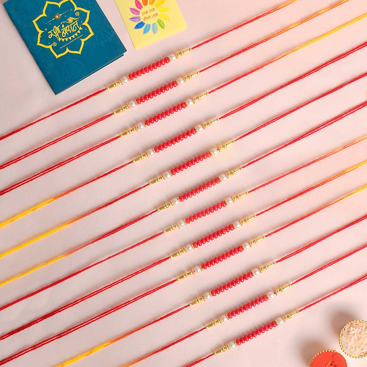 Beaded Bhaiya Rakhi Set of 2: Bedecked with colorful beads, these rakhis represent the joyous moments and cherished memories of growing up together. Embrace nostalgia and affection with this delightful beaded rakhi set.
