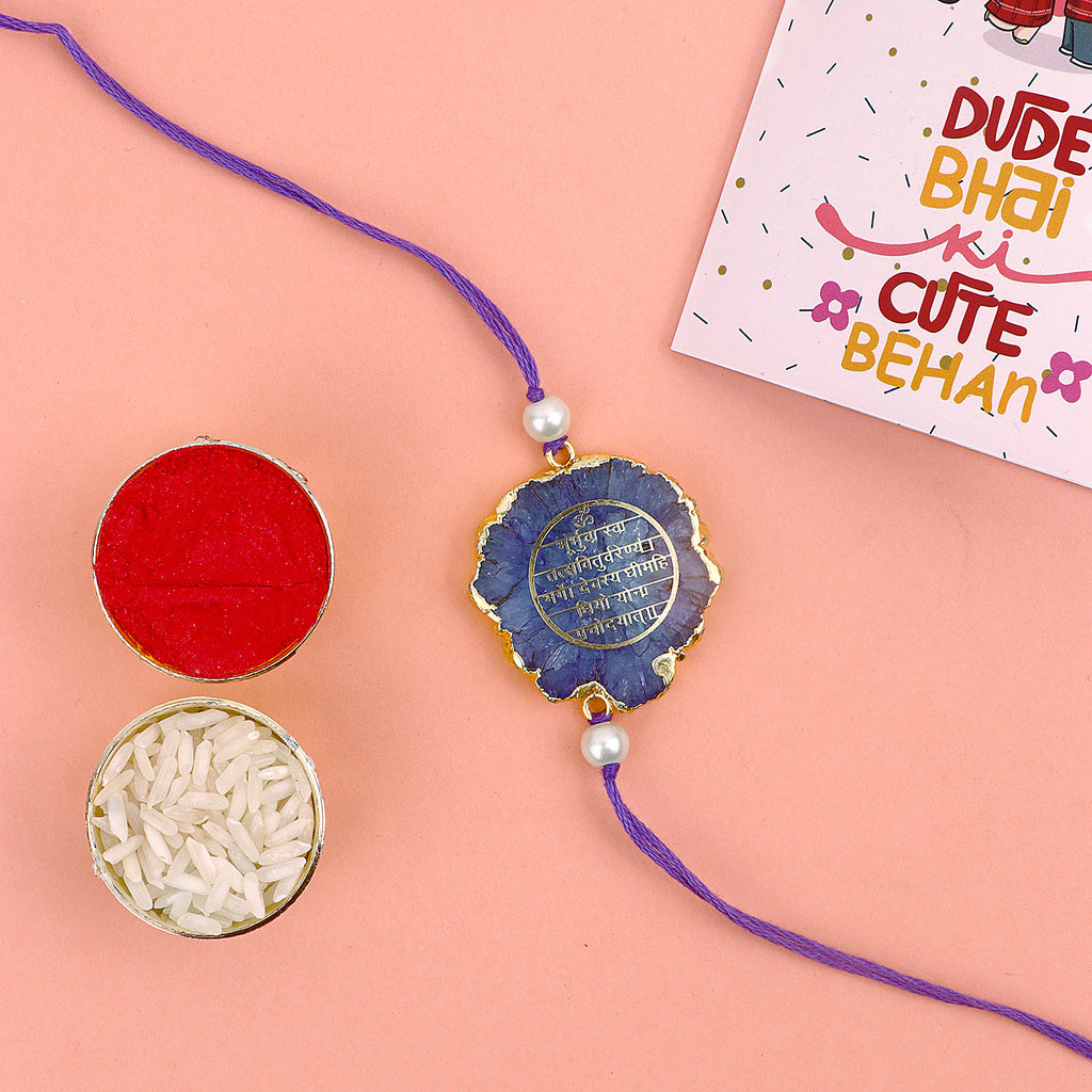 • Package: 1 Pc Agate Stone Gayatri Mantra Rakhi, Roli Akshat, Greeting Card
