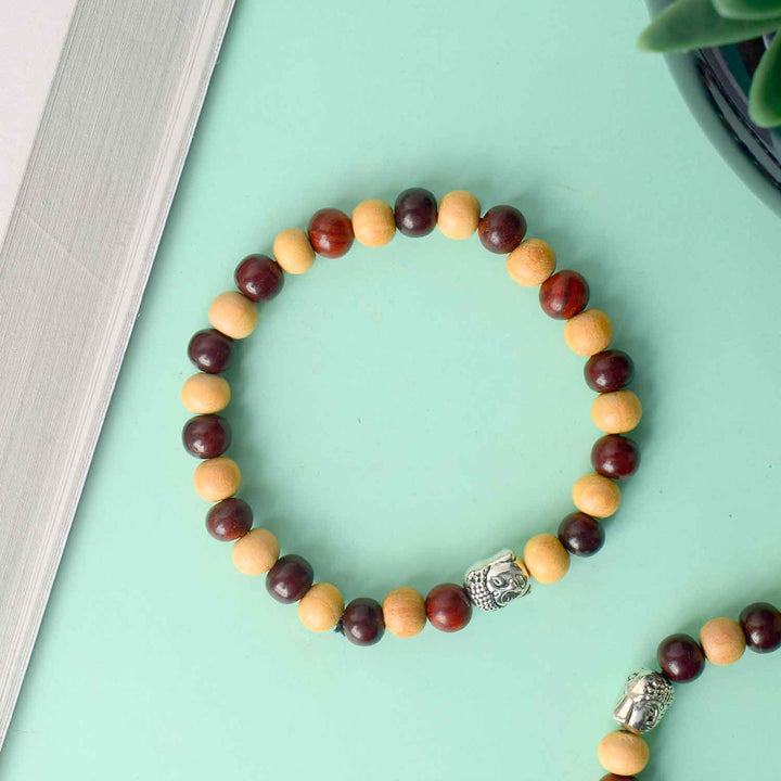 About Product The Buddha Red and White Sandal Bracelet is a divine blend of spiritual elements, designed to bring peace, clarity, and energy balance to the wearer. Made using authentic red and White Sandalwood beads, this bracelet symbolizes purity and strength. It is inspired by Buddhist traditions and worn to enhance spiritual awareness while offering calming benefits. Its dual-tone design is not only aesthetically appealing but also rich in energy and symbolism. A perfect accessory for meditation, spiritual gatherings, or daily wear.