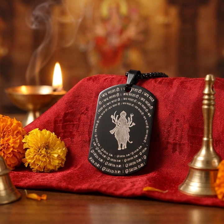About Product: The Shree Durga Maa MicroCarved Black Pendant is a finely crafted devotional accessory that showcases the divine presence of Maa Durga through intricate micro-carved detailing. The precision engraving captures the powerful aura of the Goddess, symbolizing strength, protection, and victory of good over evil, all set against an elegant black finish.