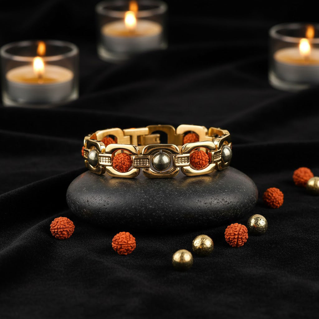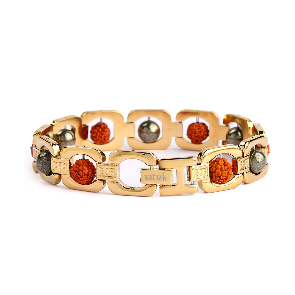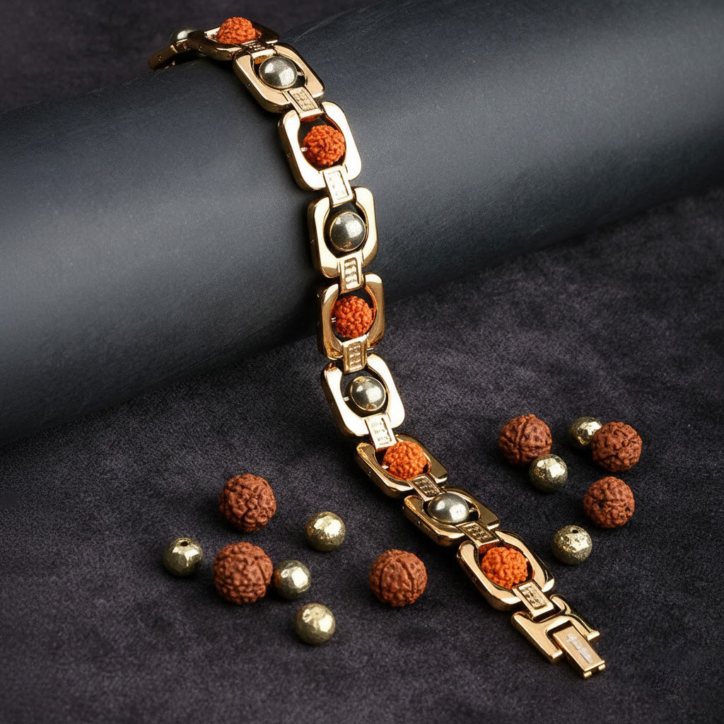 About Product: This Gold Plated Pyrite Rudraksha Bracelet blends spiritual tradition with elegant design. Crafted with natural Rudraksha beads combined with genuine pyrite stones and premium gold IGP (Ion Gold Plating), the bracelet ensures long-lasting shine, durability, and resistance to tarnishing. Designed for daily wear, meditation, or gifting, it acts as a stylish accessory while symbolizing spiritual energy, protection, and positivity.