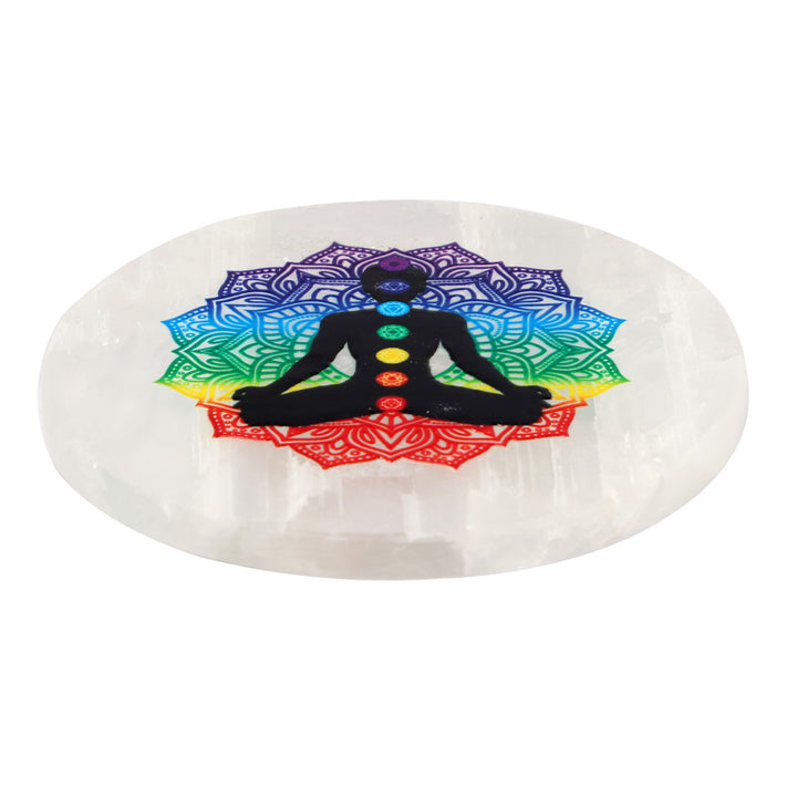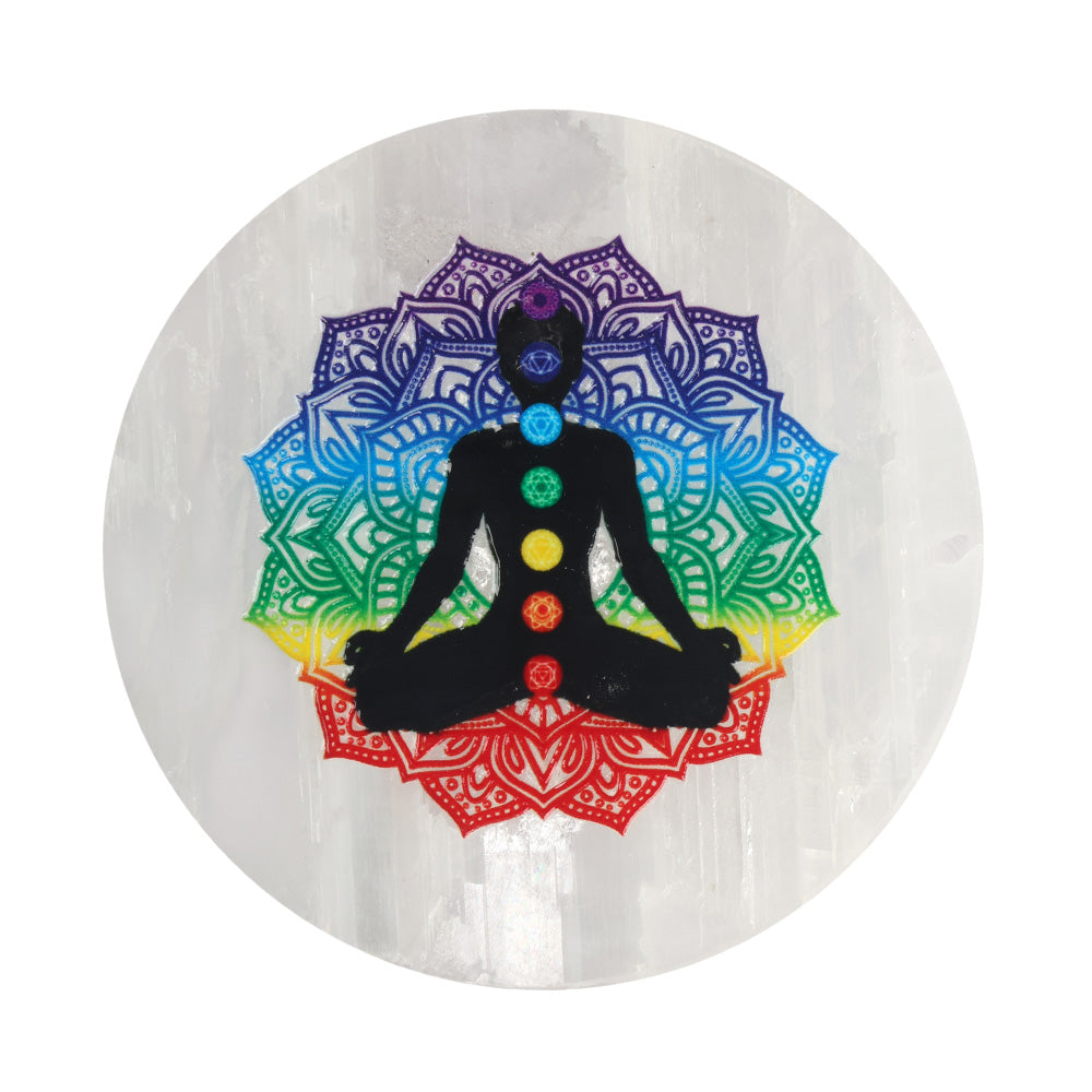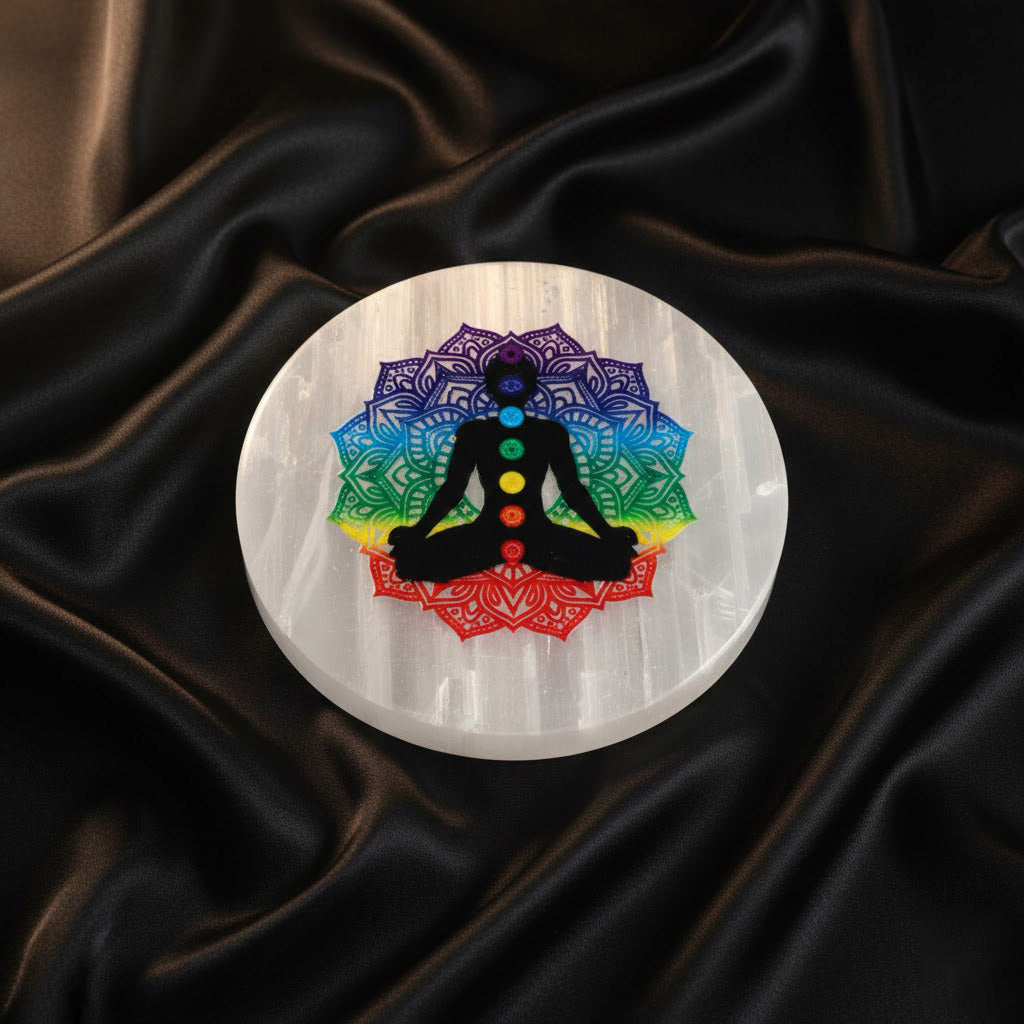 • Design: Seven Chakra Symbols Engraved on Polished Round Selenite Plate
